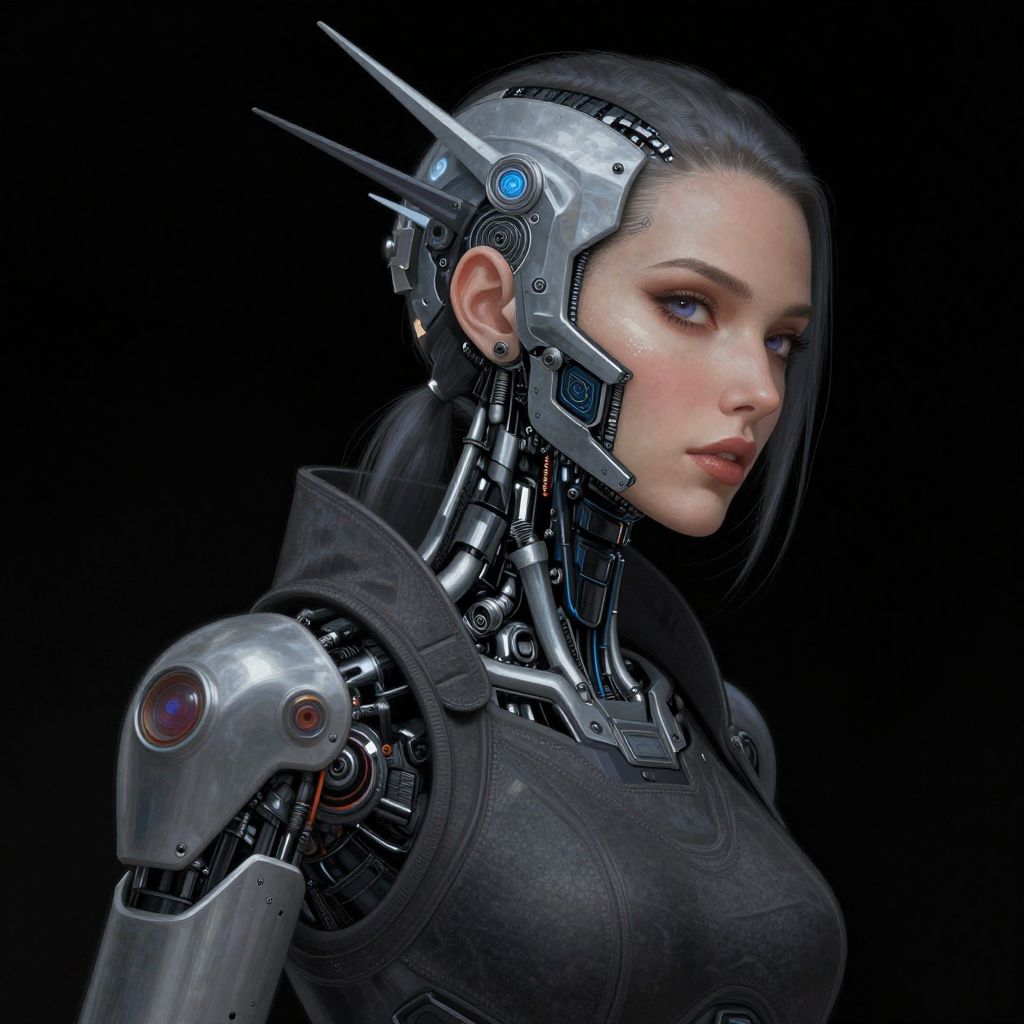 A woman with long red hair and intricate cybernetic armor, featuring glowing blue eyes and a mechanical headpiece.