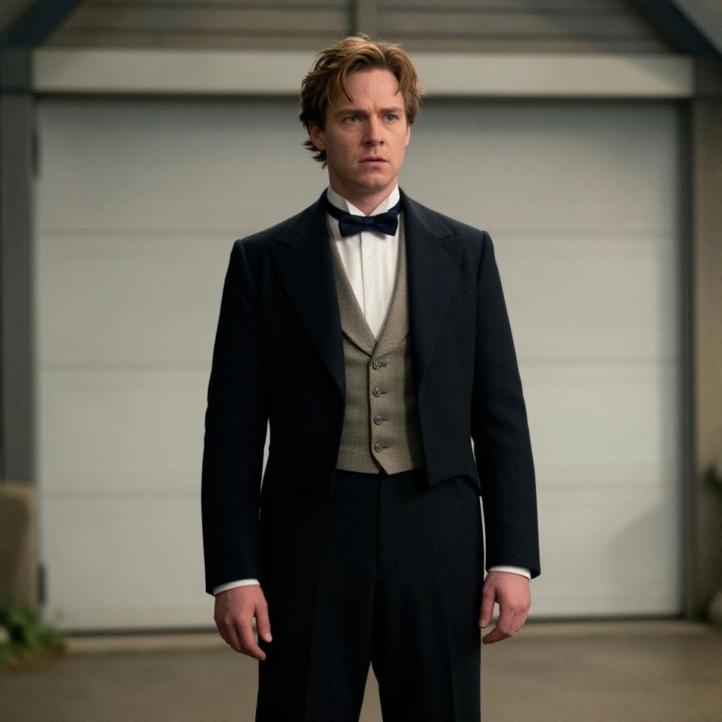 Photograph of a young man with light brown, slightly tousled hair, standing in front of a large, white garage door. He wears a black tuxedo with a white dress shirt, black bow tie, and gray waistcoat. His expression is serious, with a slightly furrowed brow. The background is slightly blurred, emphasizing the subject. The lighting is soft, casting gentle shadows. The image has a slightly desaturated, cinematic quality, with a focus on the man's formal attire and serious demeanor.