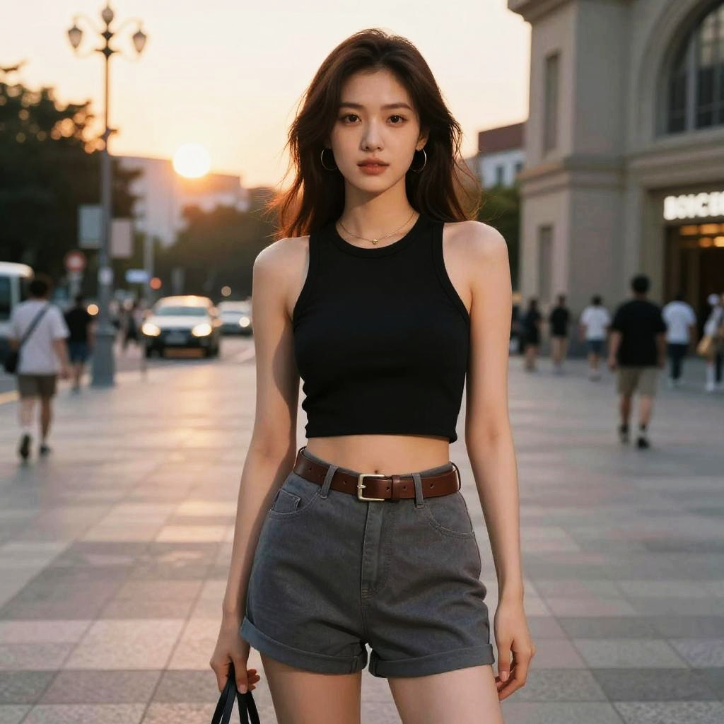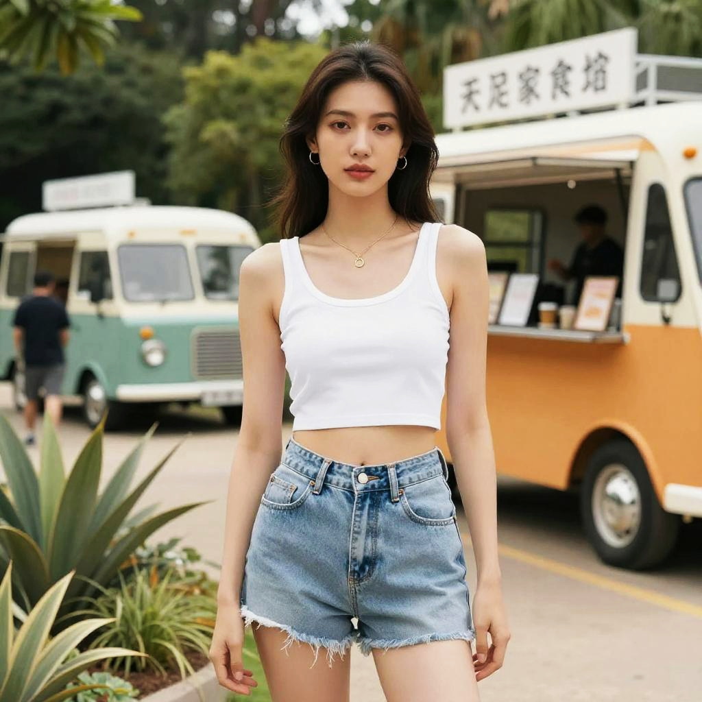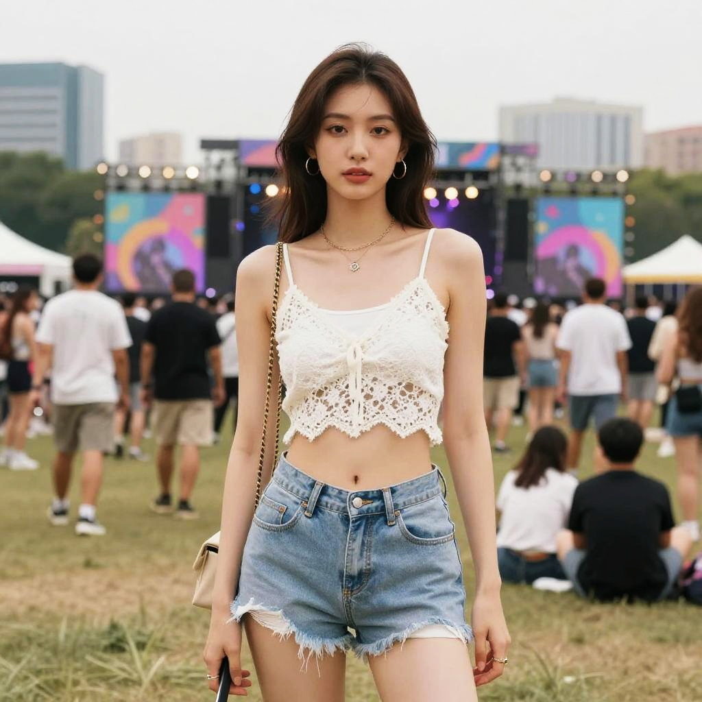 A lean woman in a casual summer style, wearing a white lace crop top layered over a white tank top and light wash denim shorts, stands at a music festival in a city park, surrounded by vibrant crowds and colorful decorations, in a selfmade hero visual style. Sexy. Pretty face and beutiful eyes