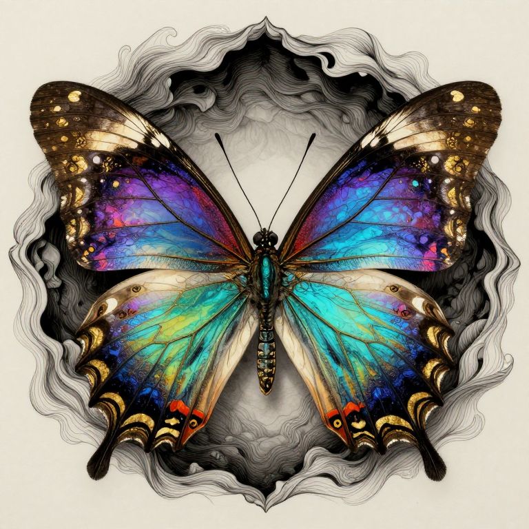 Vibrant, detailed digital artwork of a butterfly with iridescent blue, green, purple, and gold wings, framed by wavy, black