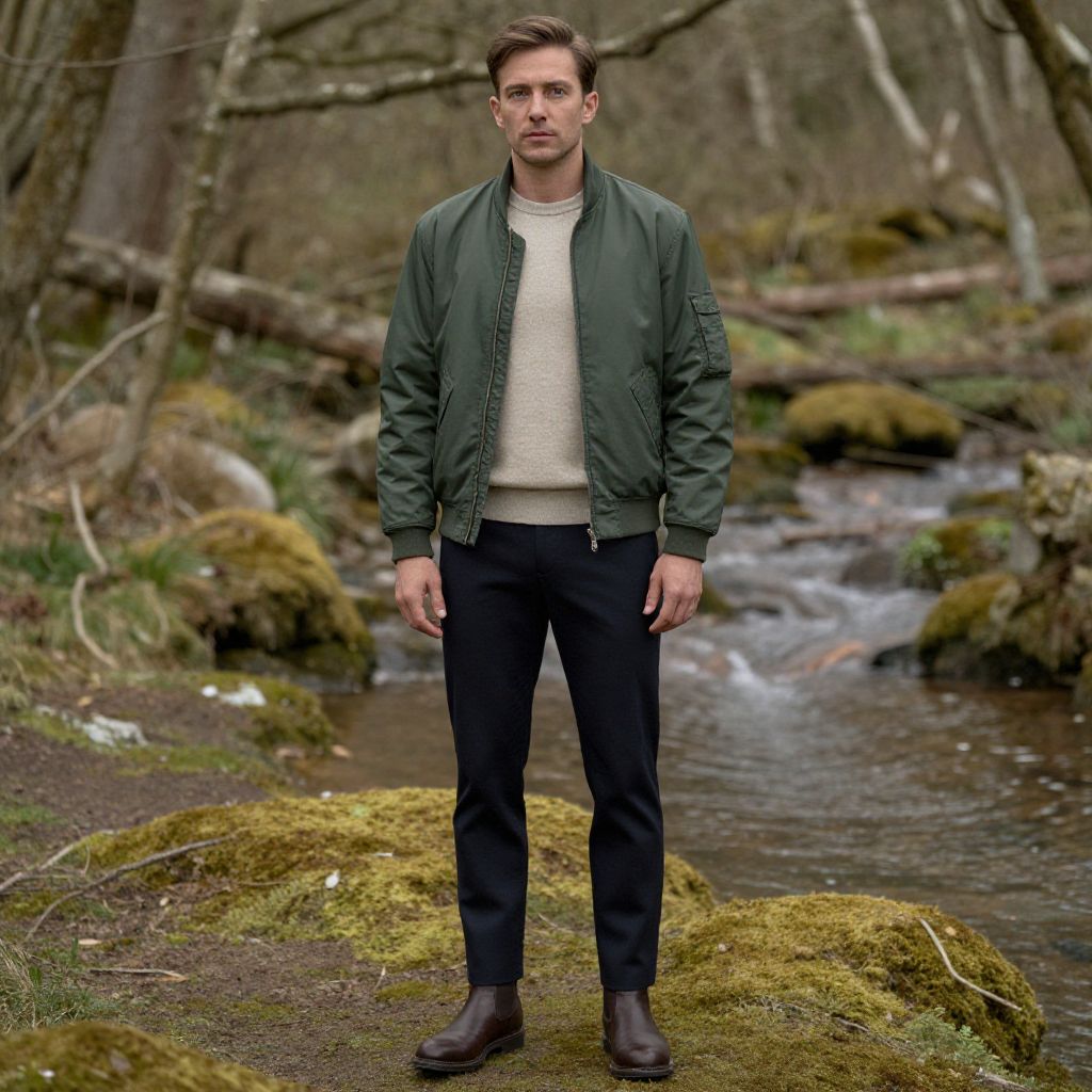 A man, forest green bomber jacket, beige crew neck sweater, slim-fit navy trousers, dark brown Chelsea boots, tranquil forest glade, soft moss underfoot, gentle stream babbling, calotype process, serene expression. Man has masculine face and piercing eyes