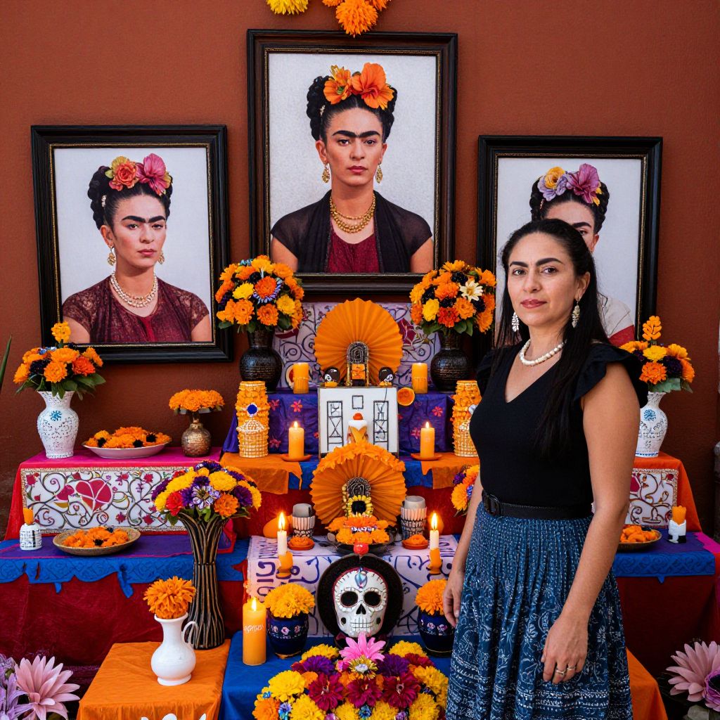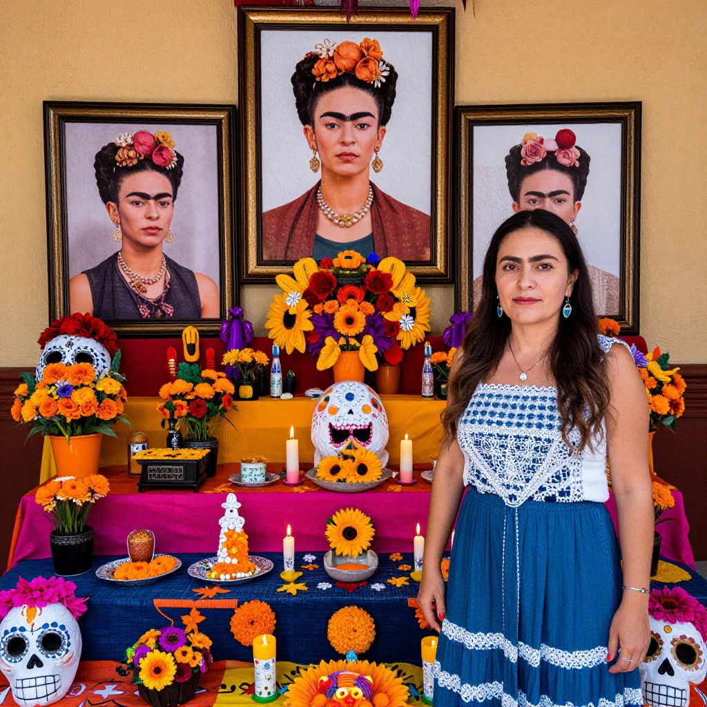 Woman standing beside a vibrant Día de los Muertos altar, featuring three framed portraits of Frida Kahlo-like figures, colorful floral arrangements, and decorative candles, highlighting her striking resemblance to the portraits. Chapala, Jalisco.