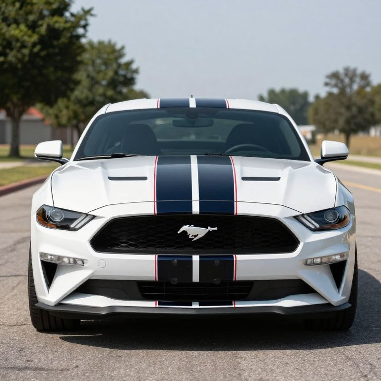Photograph of a white Ford Mustang with black racing stripes, front view, on a suburban street with trees and clear sky.