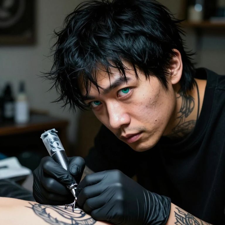 Photograph of an Asian man with messy black hair and light skin, wearing black gloves and a black shirt, intently tattooing a person's arm. He has green eyes and a tattoo on his neck. The man holds a tattoo needle in his right hand, poised above the arm. The background is blurred, featuring indistinct dark shelves and bottles. The tattooed arm, partially visible, shows intricate black and gray patterns. The image has a high-contrast, slightly dramatic lighting.