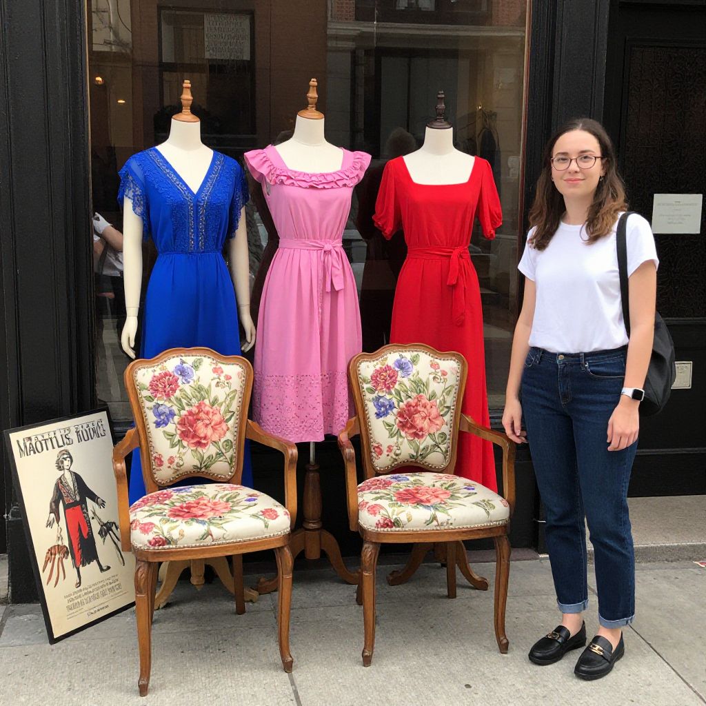 Woman standing outside Costuming on Haight, showcasing a display featuring two wooden chairs with floral-patterned cushions, three mannequins dressed in colorful costumes (blue, pink, and red), and a vintage-style poster leaning against the storefront window.