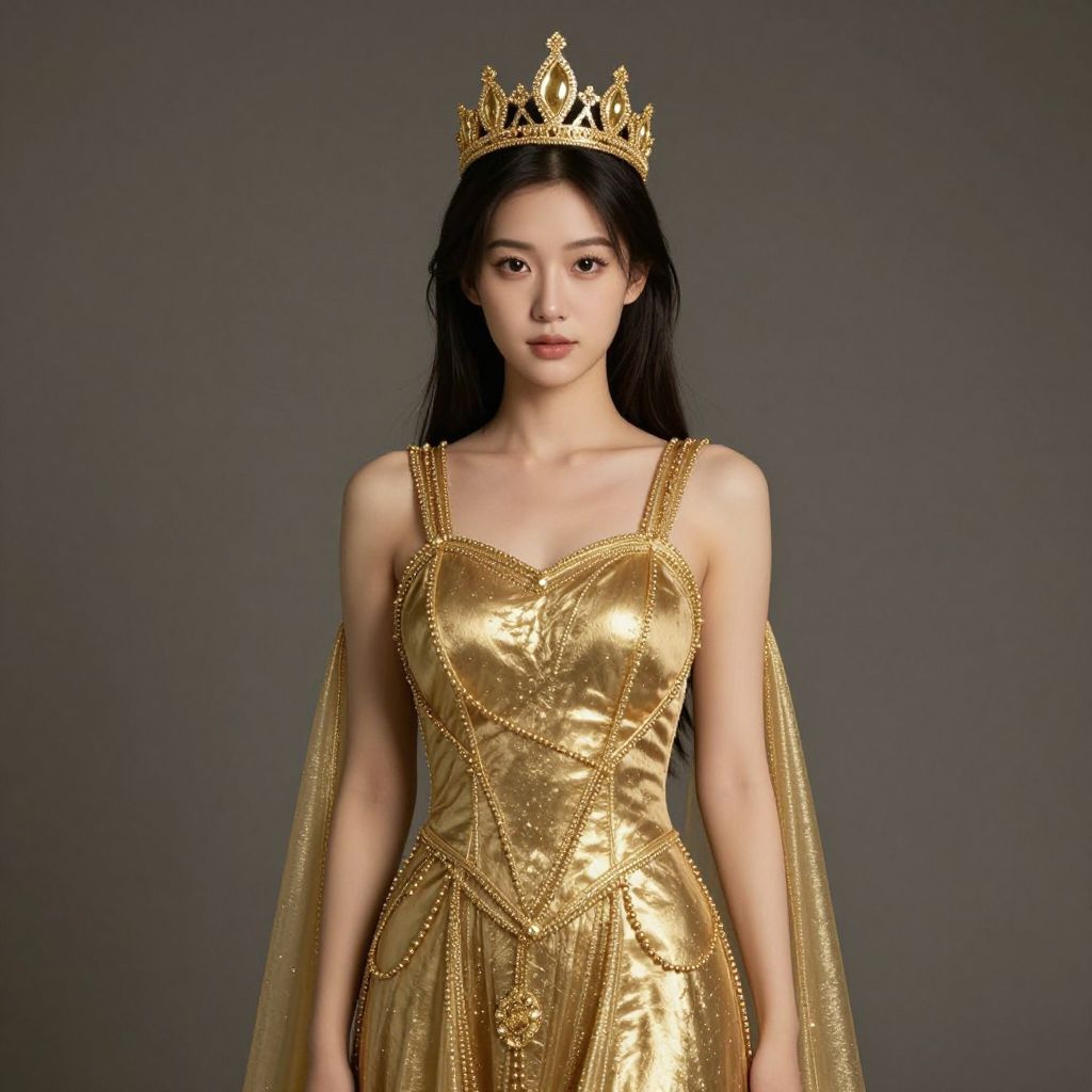 Photograph of a young Asian woman with long, straight black hair, wearing a golden, metallic, strapless dress adorned with intricate beadwork and a sheer, golden cape. She has a golden crown with ornate designs on her head. The background is a solid, dark gray, which contrasts with her glowing gold attire. Her expression is neutral, with a slight, closed-mouth smile. The dress fits her slender frame closely, highlighting her delicate features and fair skin. The image has a studio-like quality with even lighting, emphasizing the shimmering texture of her dress and the crown.