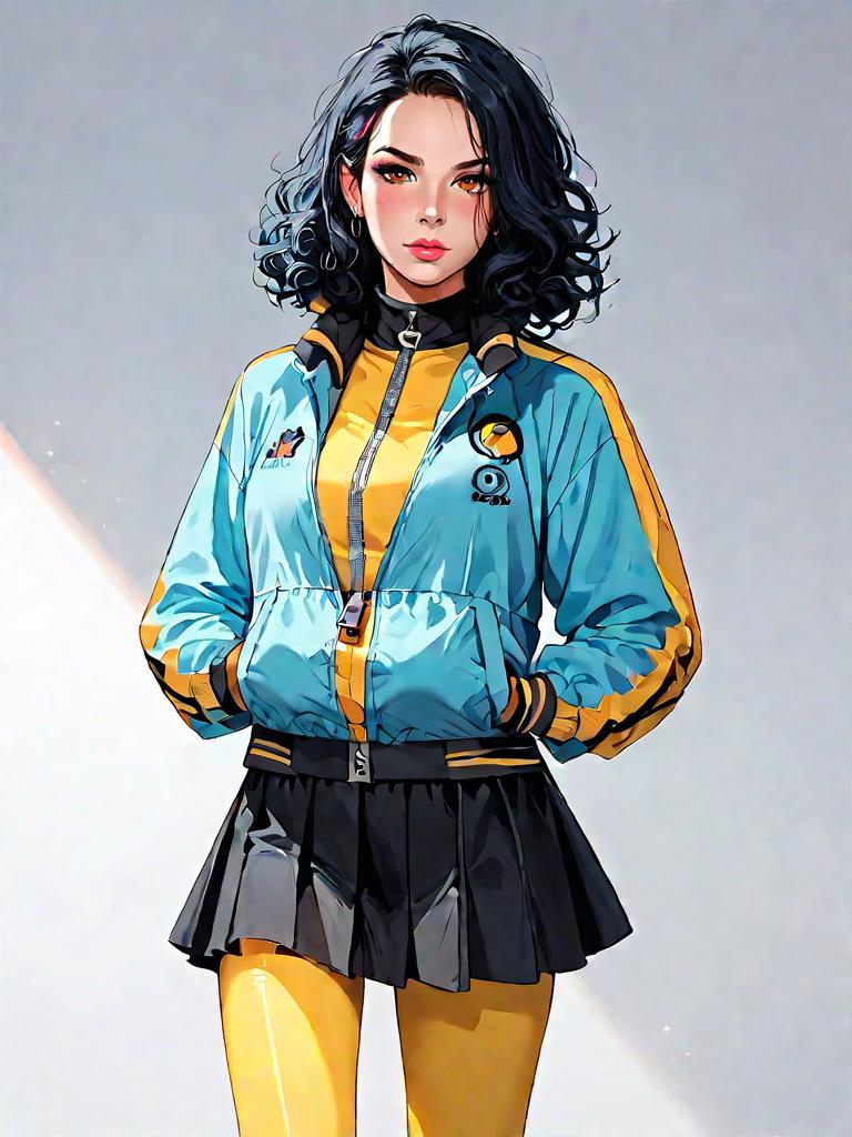 Digital illustration of a full-body shot of an athletic woman with short black hair and a realistic face. She is wearing a black sports bra with thick straps and a coordinating pair of high-rise, mid-thigh length compression shorts. The woman has a light blue oversized jacket draped over her shoulders and is wearing black and white athletic shoes. The background is plain white with a subtle circular highlight behind her.