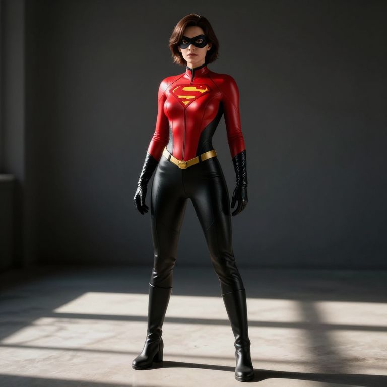 A digital CGI image of a female Elastigirl from the "Incredibles" franchise, standing confidently in a brick-walled room. She wears a form-fitting, shiny red bodysuit with black gloves and boots, a yellow utility belt, and a black mask. The bodysuit features a black "i" logo on her chest. Her brown hair is styled in a bob cut. The background includes a dimly lit, brick wall with two vertical light beams. Her stance is wide-legged, exuding strength and readiness. The image has a realistic yet stylized cartoon appearance, with smooth textures and vibrant colors.