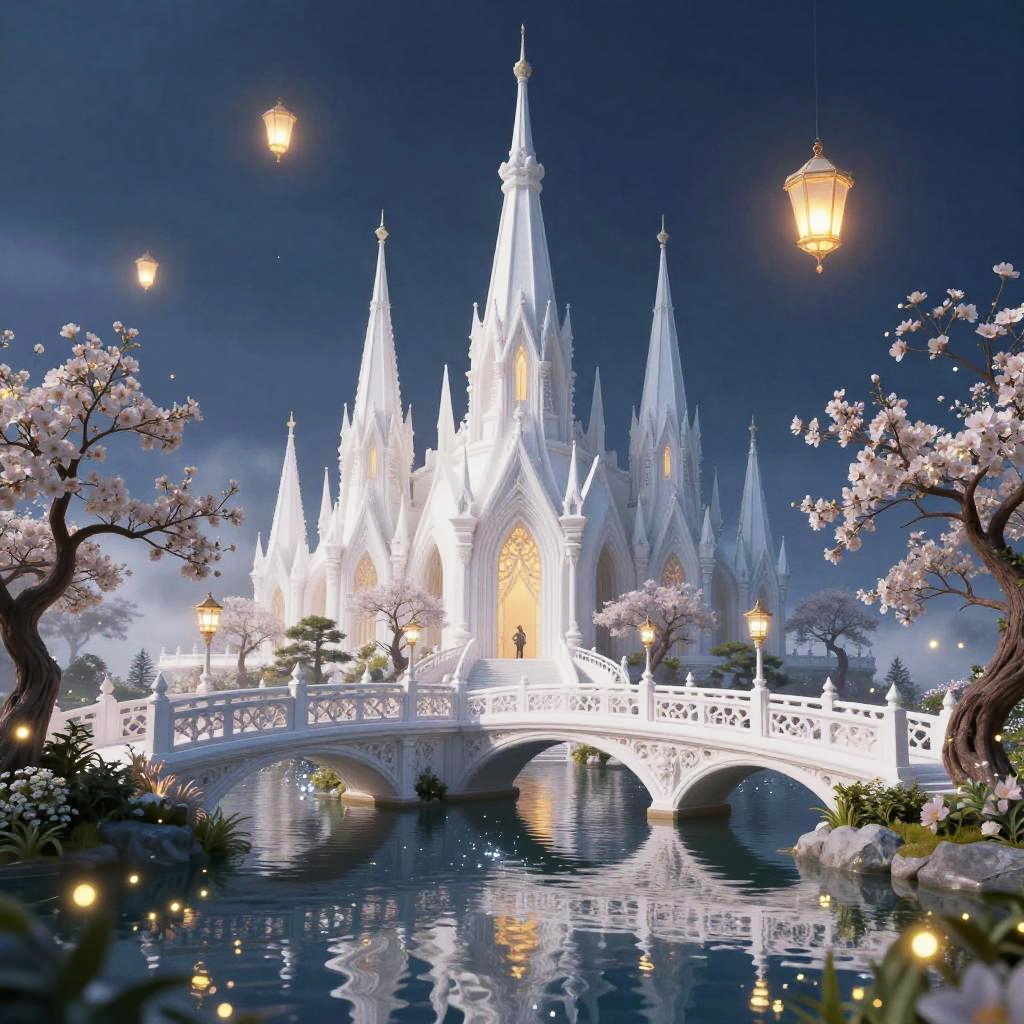 Velaris wallpaper desktop scene with majestic white spires and delicate bridges arching over sparkling waters, mystical lanterns floating in the air, surrounded by blooming night gardens filled with twinkling fireflies and gentle fog, a blend of fantasy and serenity.