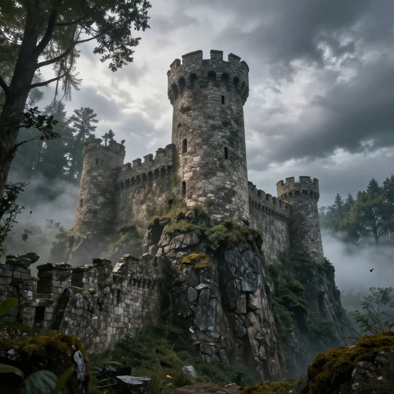 Towerd ancient stone fortress perched on a misty cliff, weathered by time, surrounded by dense enchanted forest, mystical light filtering through the trees, dramatic cloudy sky, medieval fantasy setting, detailed textures on stone walls, mysterious atmosphere evoking adventure.