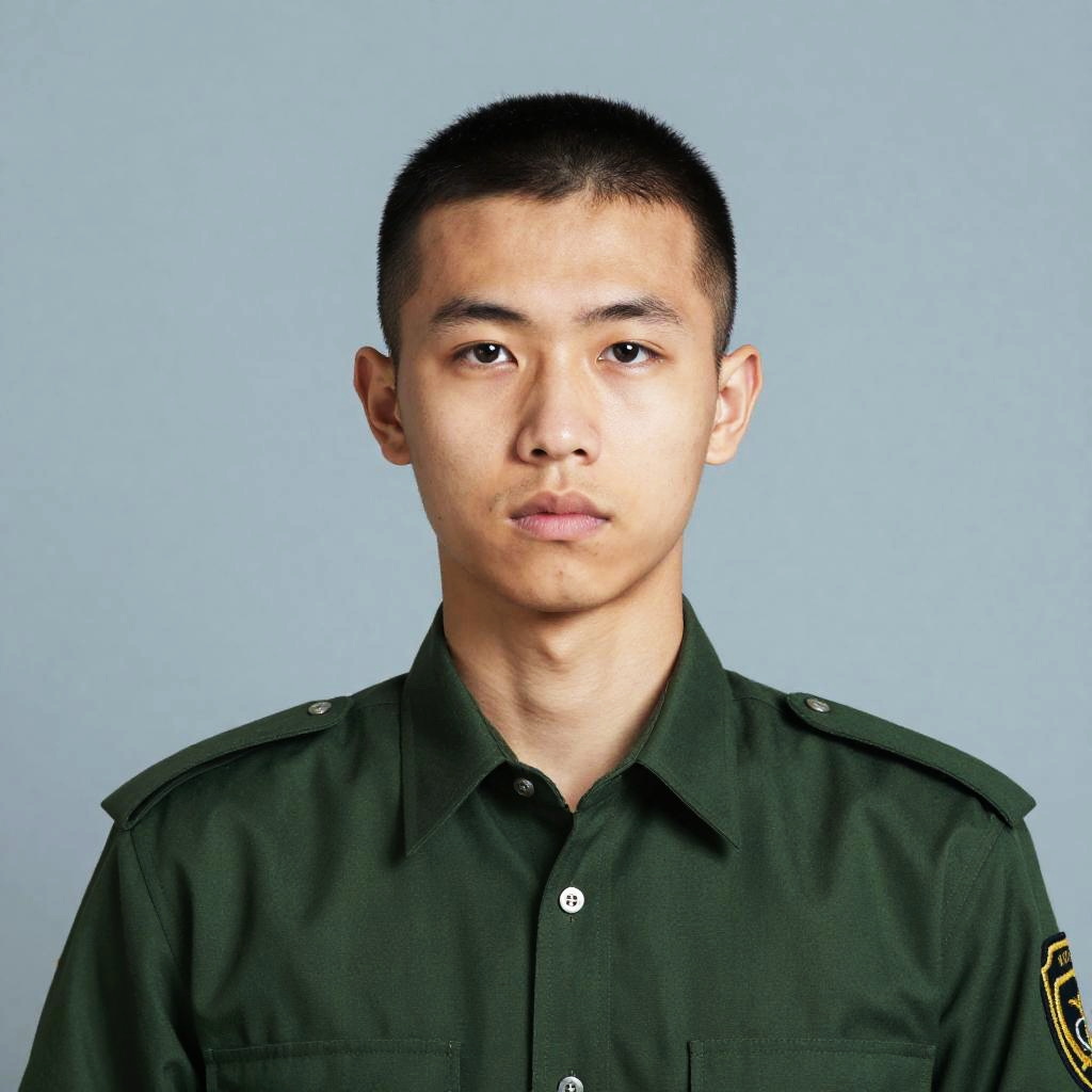 Photograph of an Asian male with short black hair and light skin, standing against a plain light blue background. He has a neutral expression and is wearing a dark green military-style uniform with shoulder epaulettes and a single button at the collar. The uniform has a small embroidered patch on the right sleeve. The image is a head-and-shoulders portrait, centered, with even lighting that highlights his facial features and uniform.