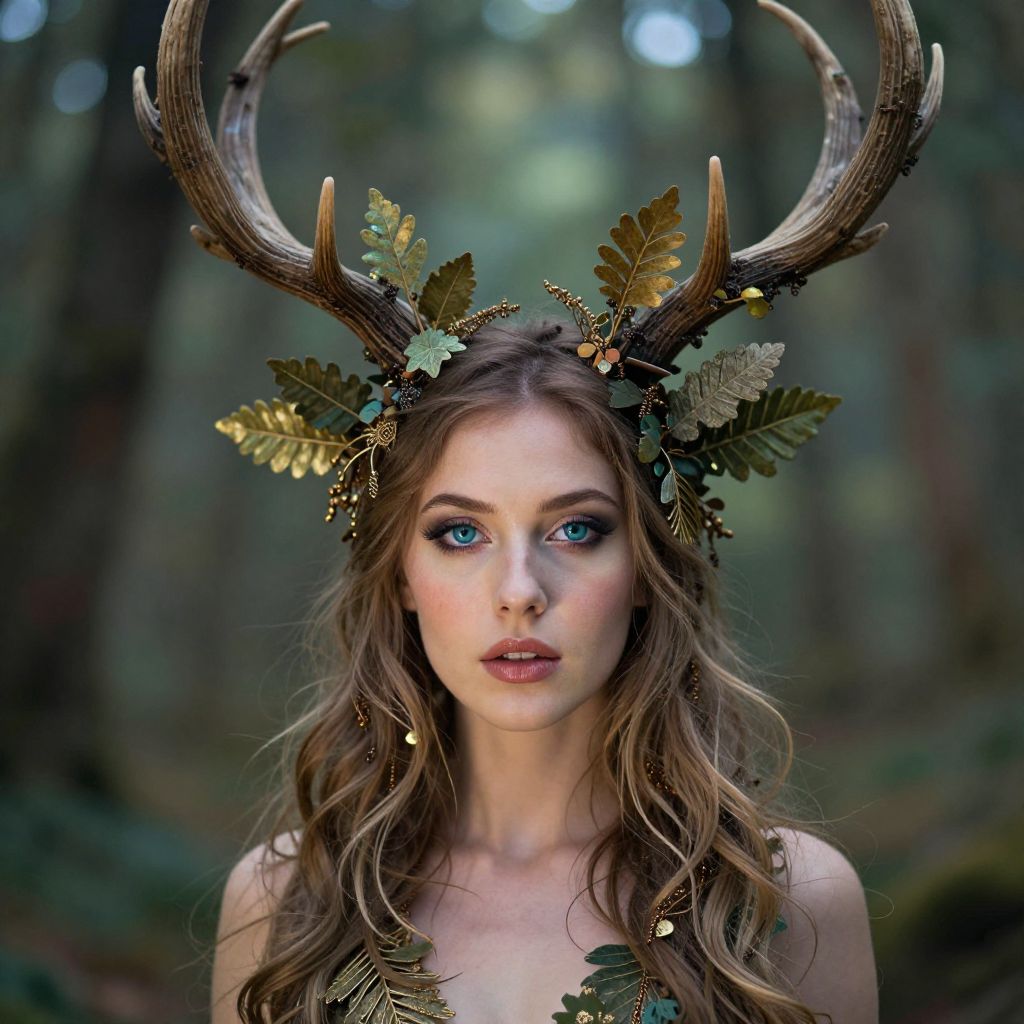 Photorealistic digital artwork of a fair-skinned, blue-eyed woman with long brown hair, wearing antler headpiece adorned with leaves, in a