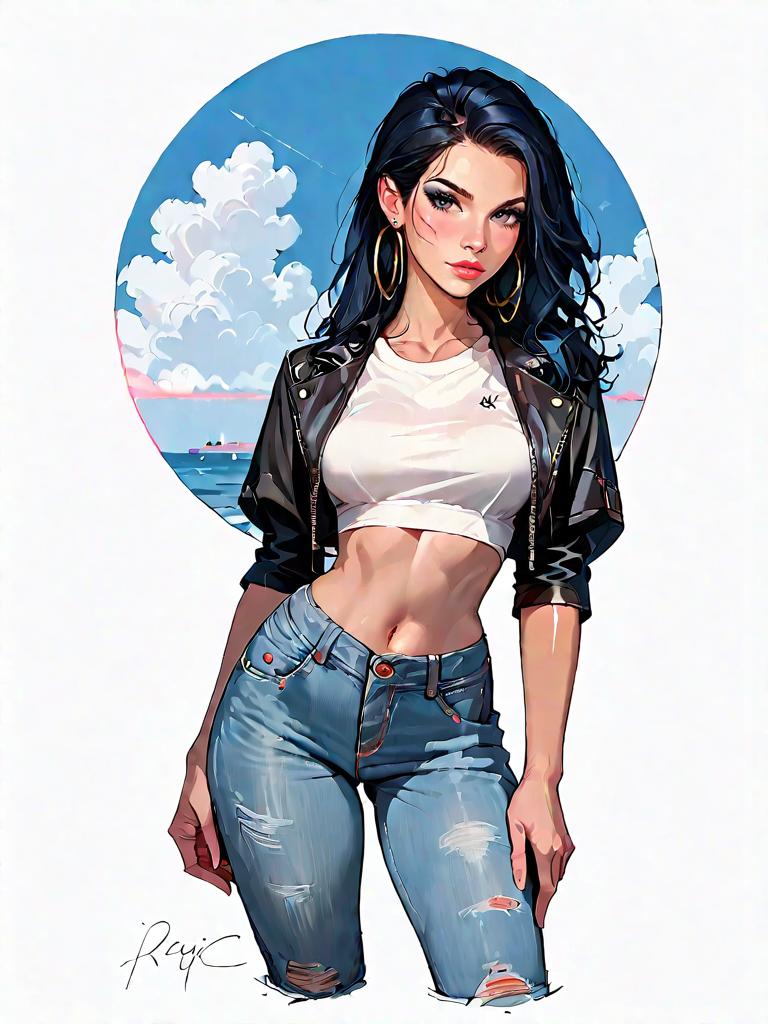 Digital illustration of a full body shot of a young woman with long dark hair wearing modern streetwear. She features a cropped faux leather jacket, a tan crop top with a low square neckline, and high-waisted distressed skinny jeans. She accessorizes with large hoop earrings and stands against a circular background featuring a blue sky with fluffy clouds and a distant ocean view.