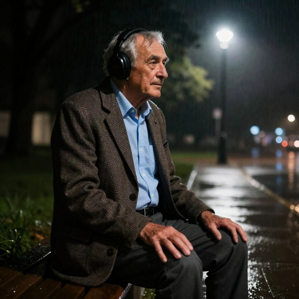 Photograph of an older man with gray hair, wearing a brown blazer, blue shirt, and headphones, sitting on a wet park bench at night