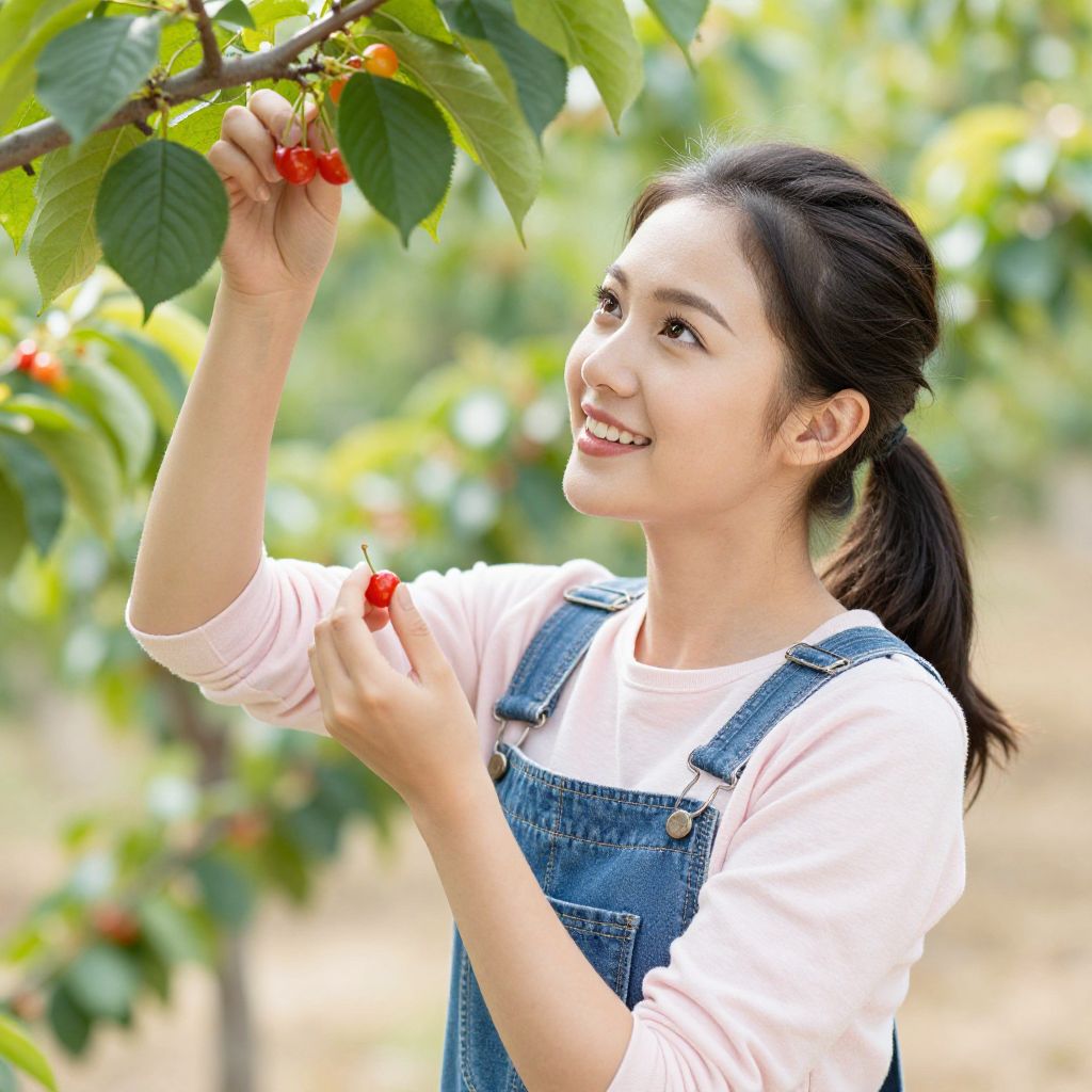 Photograph of an Asian woman with fair skin and black hair tied in a ponytail, smiling while picking red cherries from a tree. She wears a white long-sleeve shirt under blue denim overalls. The background is a blurred, sunlit orchard with green leaves and more cherry trees. Her right hand holds a cherry close to her face, while her left hand reaches up to the branch. The image has a bright and cheerful ambiance, highlighting the freshness of the cherries and the natural setting.
