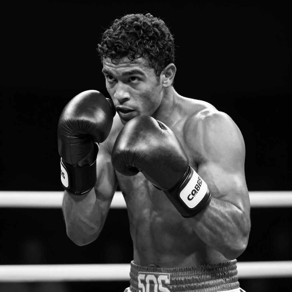 Black-and-white photograph of a male boxer with dark, curly hair, intense expression, and sweat-covered chest. He is leaning forward, wearing shiny boxing gloves, looking down with determination. Rope of boxing ring is in the background.