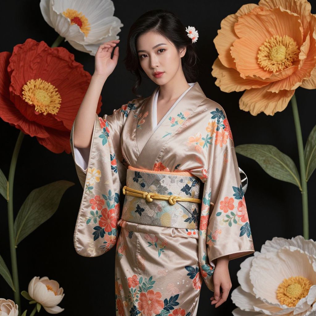 A woman in an alluring silk kimono with a floral pattern, surrounded by large, vibrant flowers, exudes elegance and sophistication.