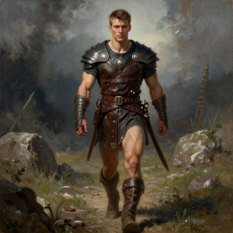 Digital painting of a muscular, serious-looking warrior with short brown hair, wearing black leather armor and boots, walking through a rocky, forested path under