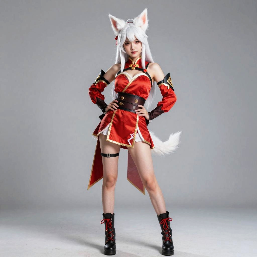 Masterpiece, best quality, (8k, RAW photo, masterpiece:1.39), (realistic, photo-realistic:1.2), Ahri_Cosplay, red costume, White Tails, (full-body angle)