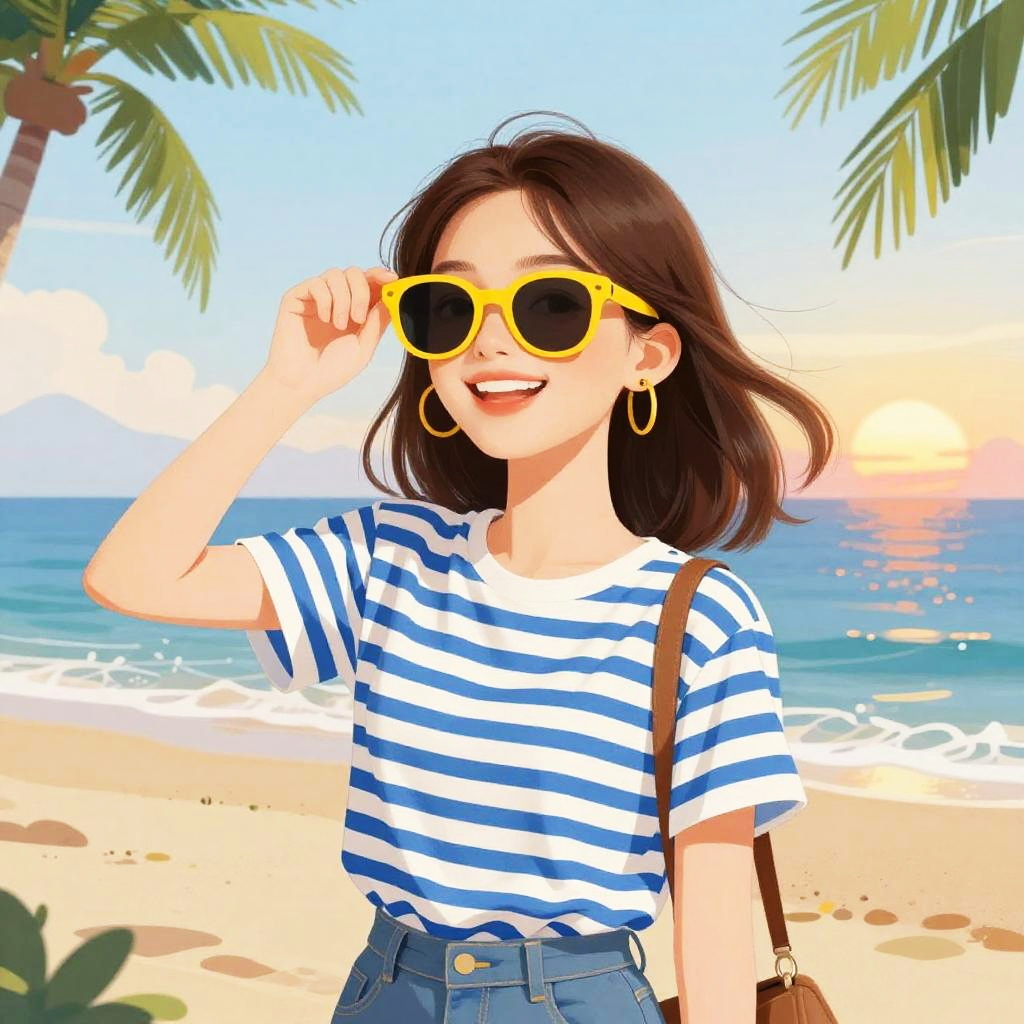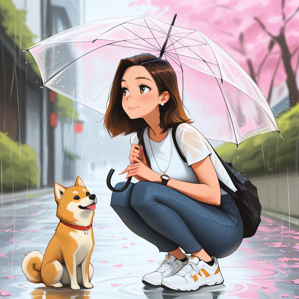 Sam yang, 1girl, animal, bird, blurry, blurry background, brown eyes, brown hair, cherry blossoms, dog, full body, holding, holding umbrella, jewelry, looking up, medium hair, necklace, rain, shiba inu, shoes, short sleeves, smile, sneakers, solo, squatting, transparent, transparent umbrella, umbrella, watch, wristwatch