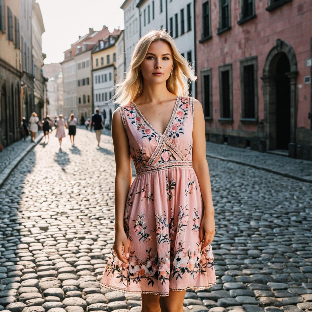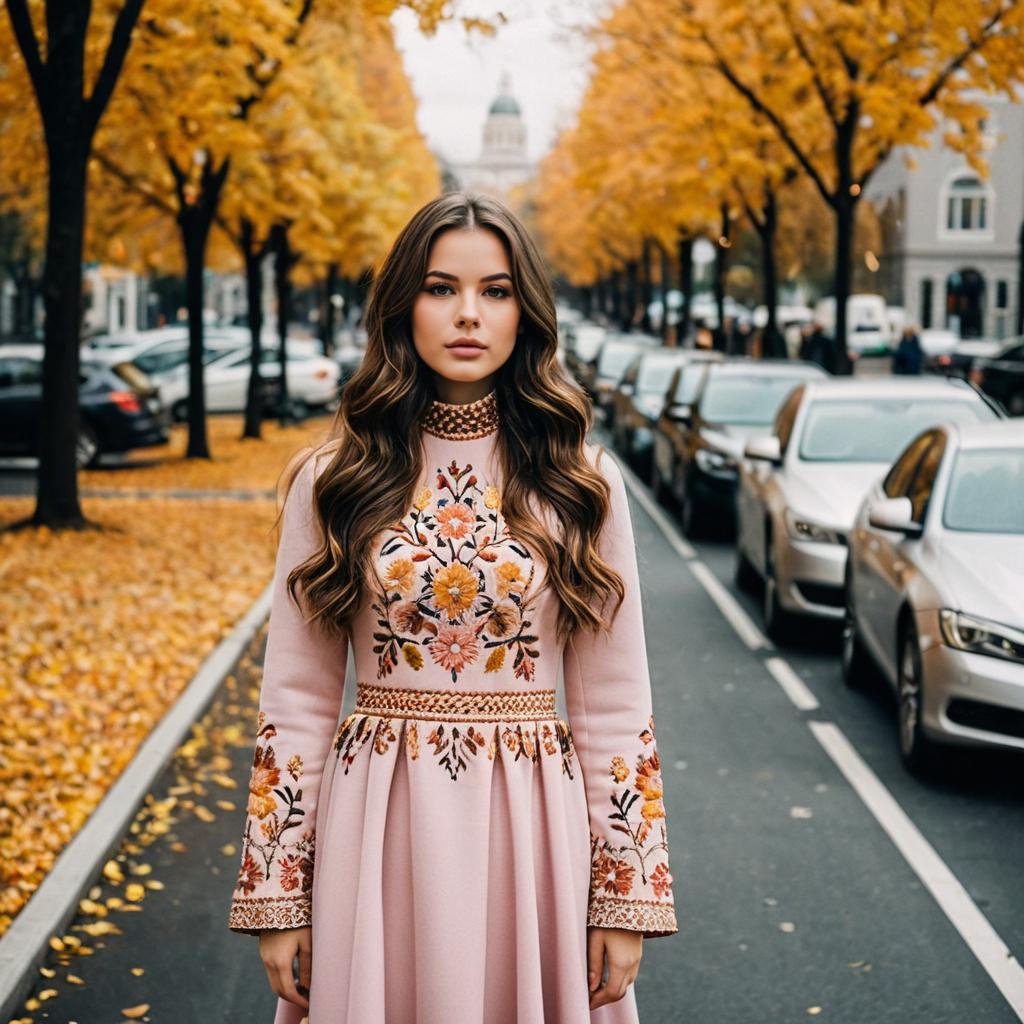 Woolen dress woman, photorealistic, young woman, standing, cobblestone street, autumn, day, long pink rib-knit sweater, matching pink rib-knit skirt, brown hair, straight, natural light, neutral expression, European architecture, buildings in background, fallen leaves, casual style, bohemian, soft colors, detailed ures, realistic lighting, street photography vibe