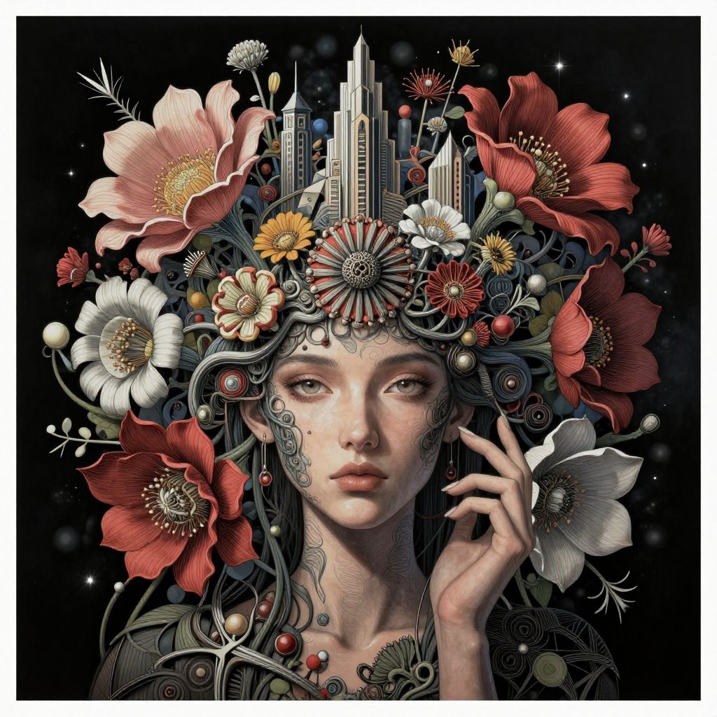 A neo transhumanistic flowers, an bionical fractal city, pretty professional photograph of a bizarre otherworldly by Hajime Sorayama and Peter Rubens, bold lines, hyper detailed, dark limited palette, chiaroscuro, fuzzy background, sharp foreground, amazing depth, double exposure, perfect balanced, deep fine borders, smooth, educed details, extra digits, strong geometric shapes, masterpiece, naturalistic colors, (wide angle view, ultra-wide angle perspective), realistic shadows, (center composition, symmetry and balance), (high detail face, high detail skin), dynamic pose, sharp focus, reduced details; lacy drawing pen + hot wax brush + laser eraser + jewelry sponge