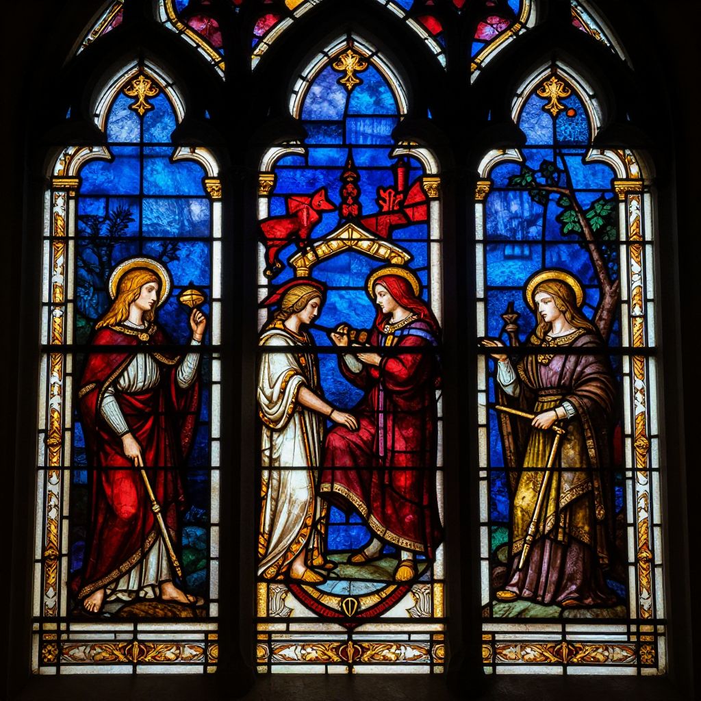 Stained glass generator displaying an ornate medieval-style window with intricate scenes and motifs, deep blues, reds, and gold hues illuminated by backlight, detailed leadwork outlines, evoking a serene and historical atmosphere.