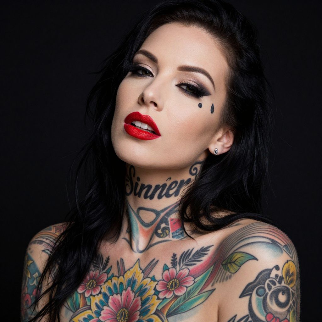Photograph of a heavily tattooed woman with pale skin and dark hair. She's wearing a white bandana and silver hoop earrings, posing with arms raised, showcasing intricate black and gray tattoos covering her arms and face. Her eyes are closed, lips slightly parted, and she exudes a rebellious, edgy vibe. The background is plain white, making her tattoos and expression stand out.