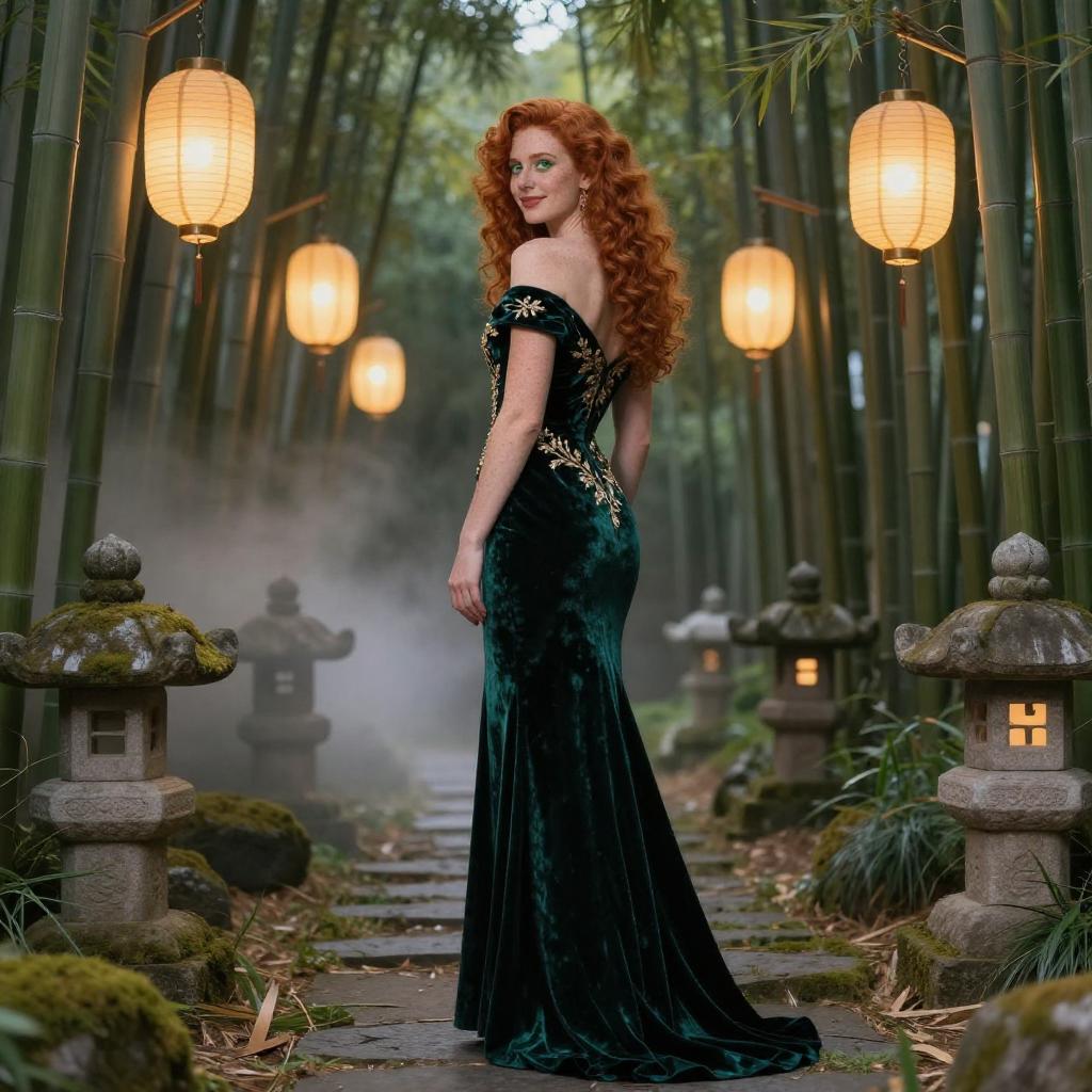 Masterpiece, best quality, (photorealistic:1.4), full body, ultra-detailed photo of a tall curly red-haired woman with freckles and emerald green eyes, wearing a flowing emerald velvet evening dress with off-the-shoulder sleeves and intricate gold embroidery, standing in a serene moonlit bamboo grove at dusk with warm paper lanterns hanging between stalks, stone lanterns along a mossy path and a thin veil of mist, smiling with an hourglass silhouette, viewed completely from behind