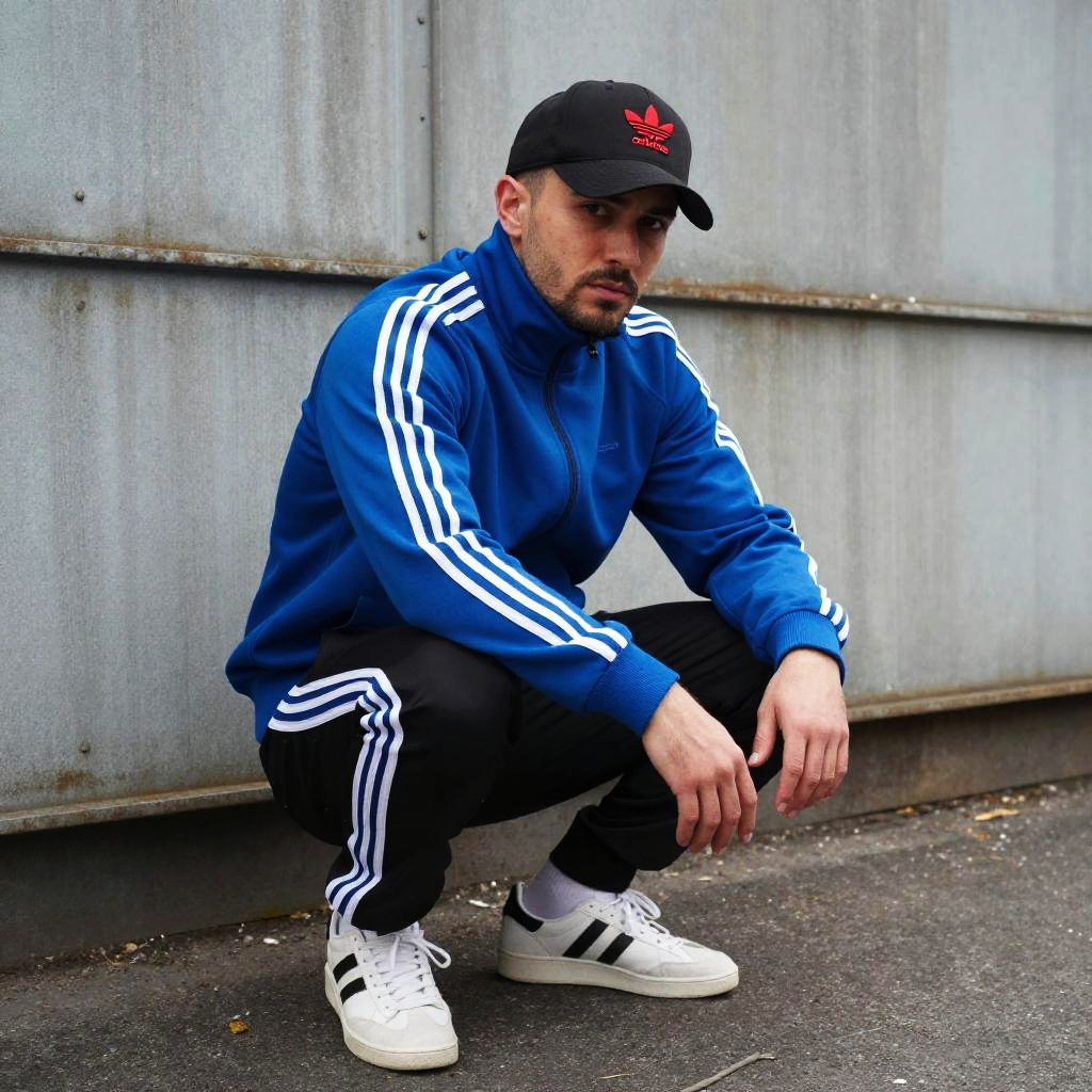 Gopnik outfit, squatting man in Adidas tracksuit with slouchy cap, industrial urban backdrop with worn textures, soft ambient light, street culture realism, vibrant colors