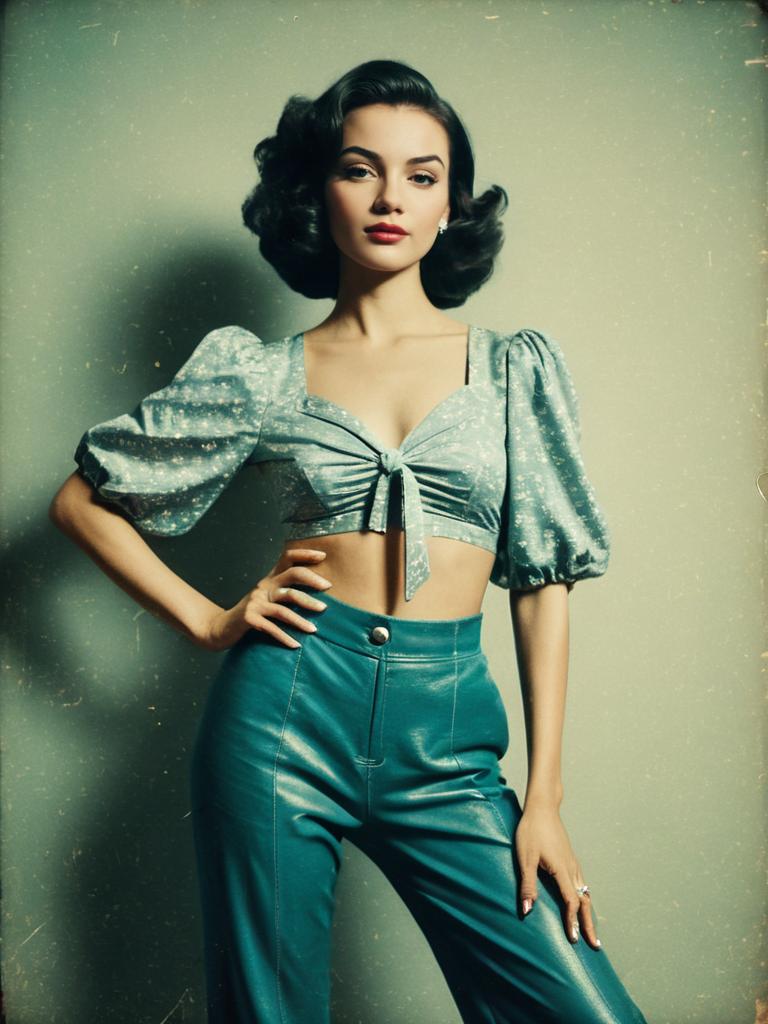 Woman, contemporary streetwear, cropped tie-front blouse in pale pink, puff sleeves with elastic cuffs, black faux leather pants with white graphic print on the thighs, straight-leg cut, high-waisted, clear strap open-toe heels, minimal jewelry, white studio background. --sref 1387