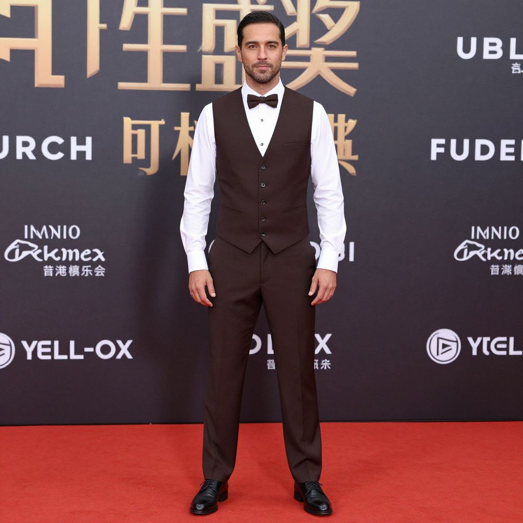 Brown Pants Outfit Male Costume, man in brown vest and brown pants standing in front of a red carpet
