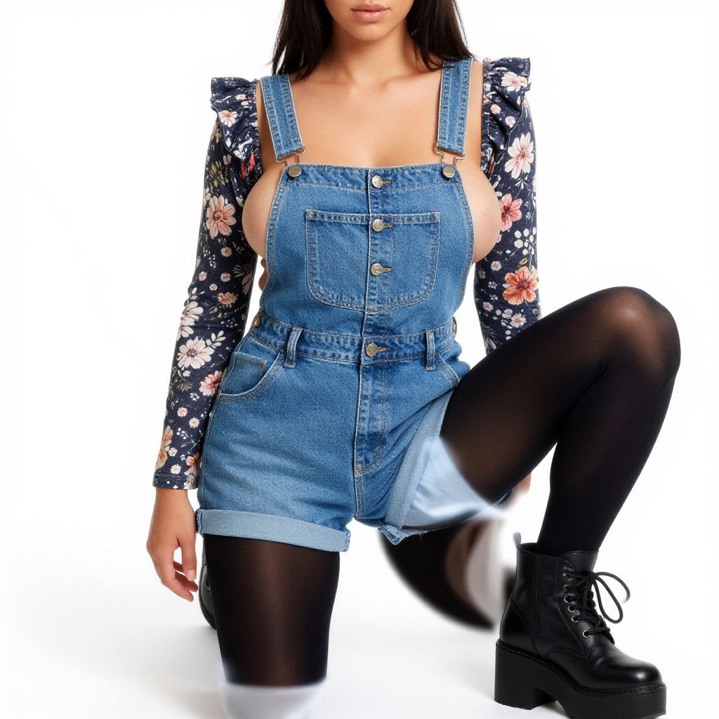 "Woman, casual streetwear, denim overall shorts with a bib front and buttoned side closures, floral print long-sleeve top with ruffled shoulders, black opaque tights, lace-up black platform boots, white studio background.. Sexy. Pretty face and beаutiful eyes. Big breasts."