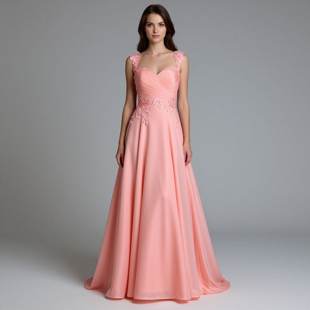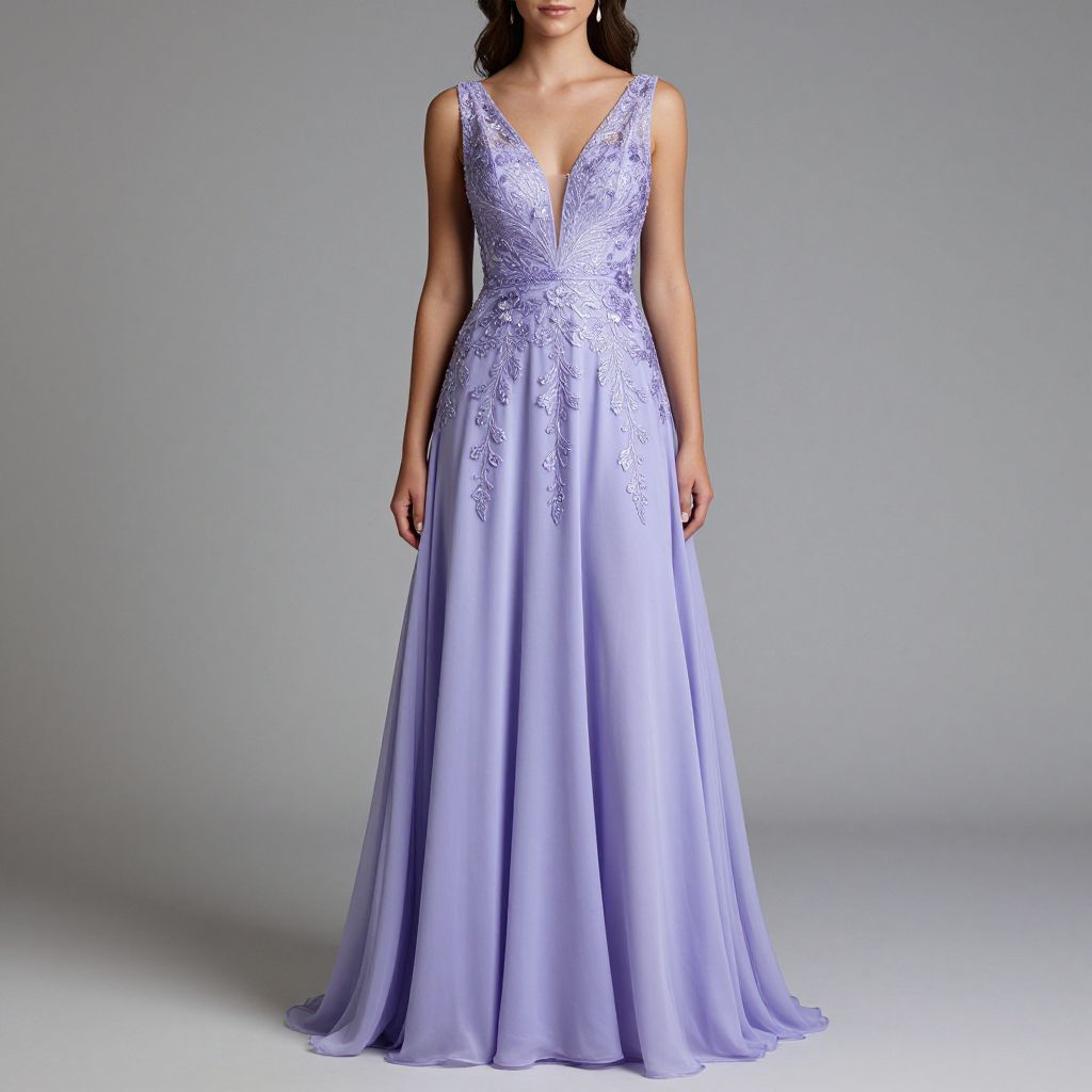 Elegant woman showcasing a lavender A-line prom dress featuring a deep V-neckline, intricate floral appliqués, and a flowing chiffon skirt, perfect for formal evening events.