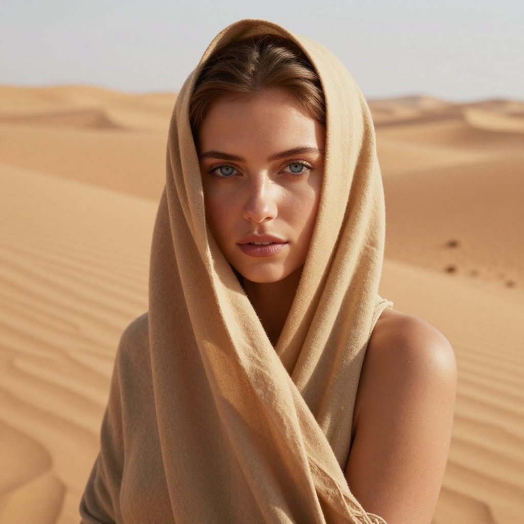 A photorealistic portrait showcases a young woman with piercing blue eyes and sun-kissed skin amidst the vast desert's dunes. Partially veiled by a cascade of golden sand, her captivating gaze exudes serenity and wanderlust. The interplay of light and shadow on the undulating landscape contrasts mesmerizingly against her smooth features, highlighting nature's raw beauty intertwined with human grace. This poignant image encapsulates exploration and resilience, inviting observers to contemplate the profound connection between one's inner journey and the vast surroundings.