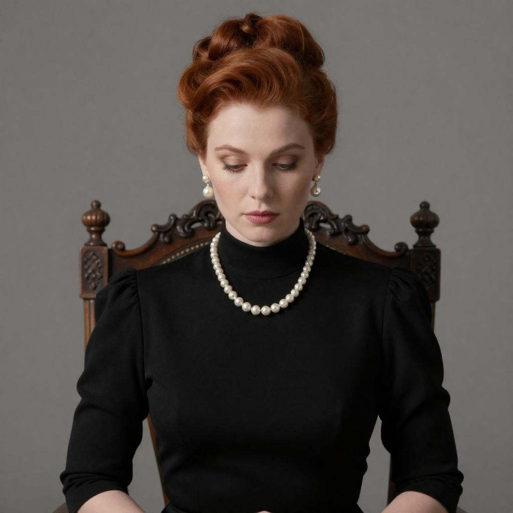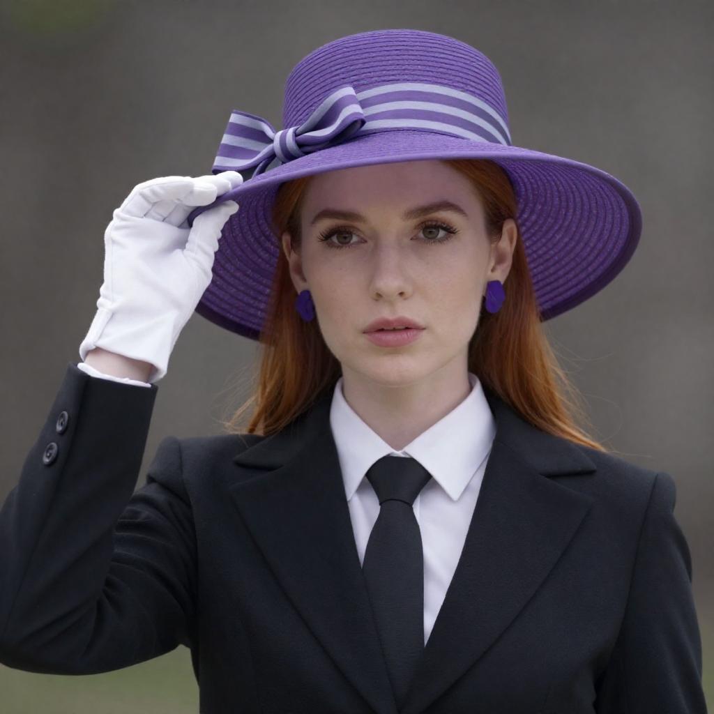Photograph of a woman with fair skin and red hair, wearing a large purple hat with a purple and white striped ribbon. She has purple earrings, white gloves, and a black suit with a white shirt and black tie. She holds the brim of her hat with her right hand, looking to the right with a slightly serious expression. The background is blurred and dark.