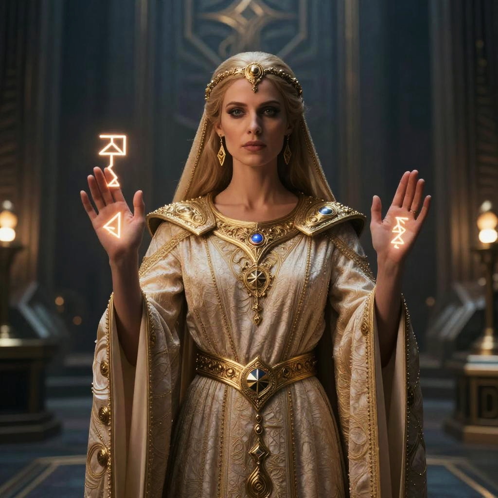 Photograph-like CGI of a regal, blonde woman with fair skin standing in a dimly-lit, ornate room. She wears an elaborate, golden, medieval-style gown with intricate embroidery and a headpiece adorned with jewels. Her hands are raised, glowing runes float above them. The background features dark, luxurious panels with intricate designs and warm, ambient lighting from tall candelabras. She has a serious expression, and the image has a fantasy, magical realism style. The gown is cinched at the waist with a jeweled belt, and she wears a blue gemstone pendant.