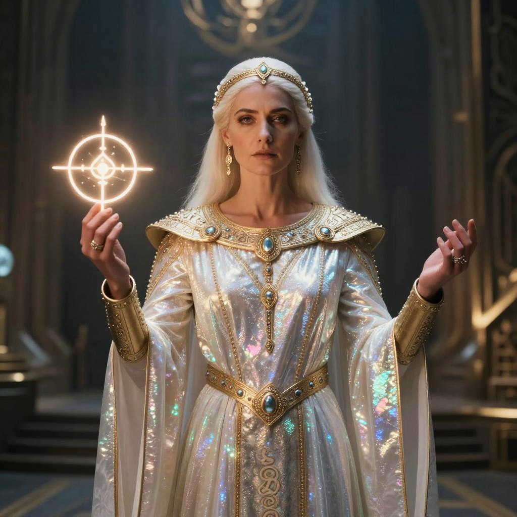 Realistic photo.Elegant portrait of an Aeldari Farseer, wearing ornate psychic robes, holding psychic runes, against an ancient craftworld interior. realistic photo