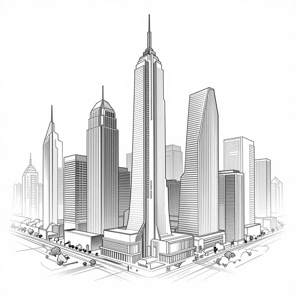 AI line art depicting a futuristic cityscape with clean, intricate black and white lines, sharp angles, and subtle shading, highlighting the fusion of technology and art in a minimalist style on a white background.