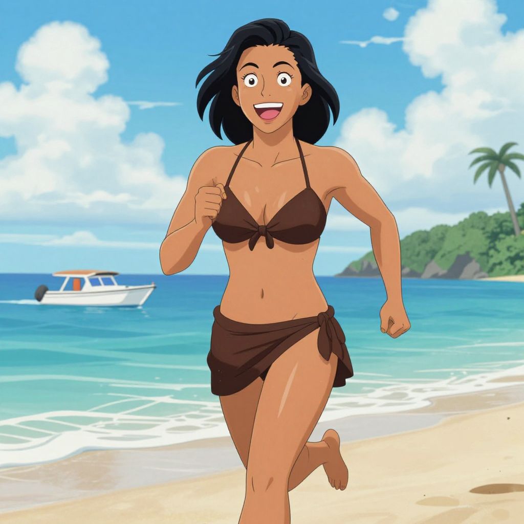Digital cartoon of a smiling, tan-skinned woman with black hair, wearing a brown bikini and sarong, running on a sunny beach with a blue