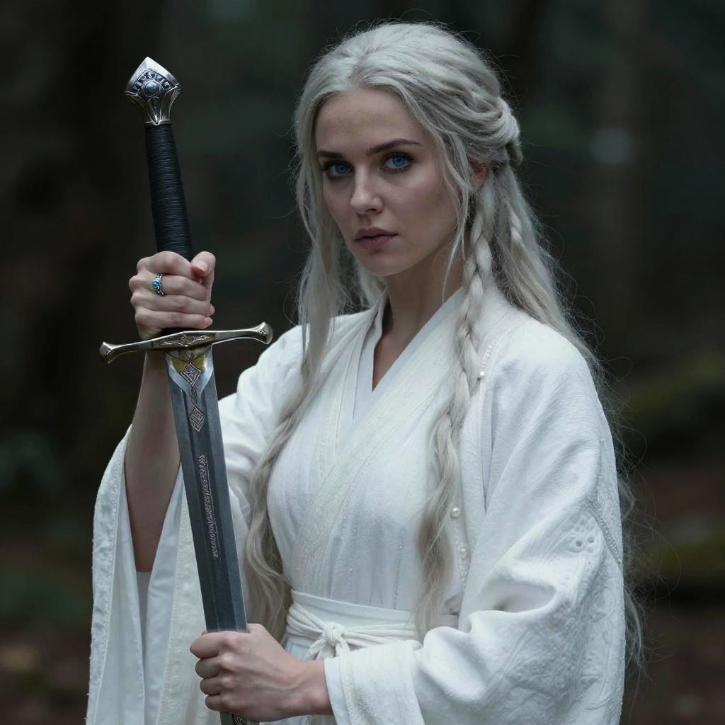 Photograph of a young woman with long, platinum blonde hair in loose braids, wearing a white, long-sleeved, kimono-style robe. She holds a black, ornately designed sword with a silver hilt in her right hand. Her expression is serious, with piercing blue eyes. She wears a silver ring on her right middle finger. The background is a blurred, dark forest, adding a mysterious and somber atmosphere to the image. The lighting highlights her hair and robe, creating a stark contrast against the dark forest.