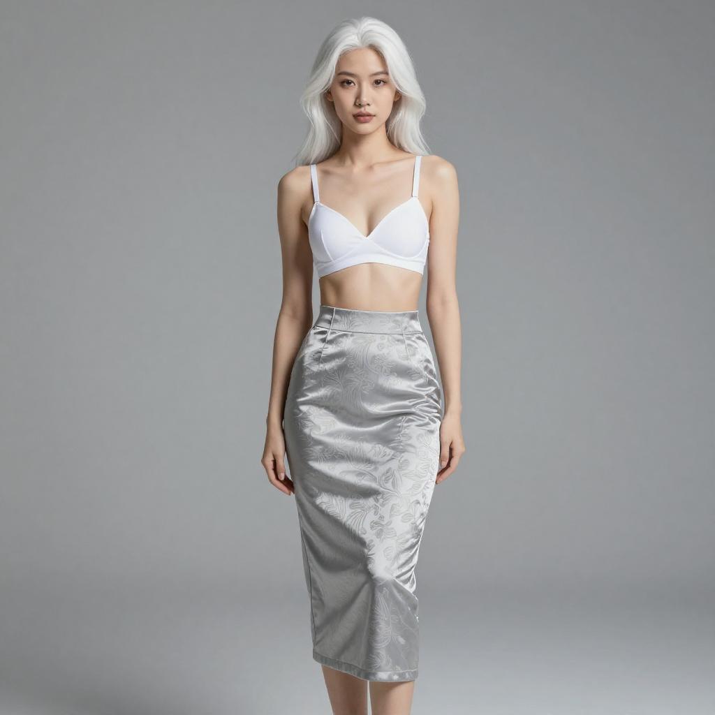 A slender Asian woman with medium-length white hair stands against a gray background wearing a white bralette and a high-waisted silver midi skirt with a subtle floral pattern. She has a neutral expression and is styled in modern, elegant formal wear.