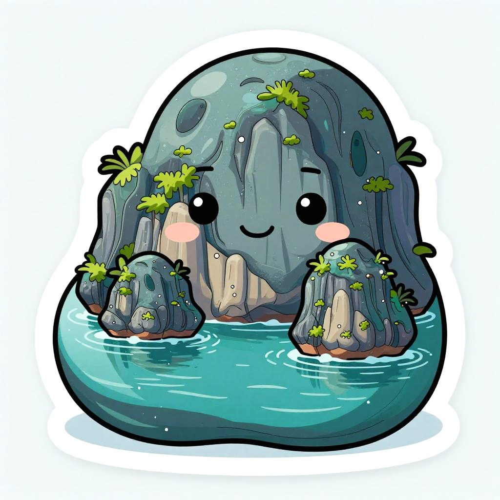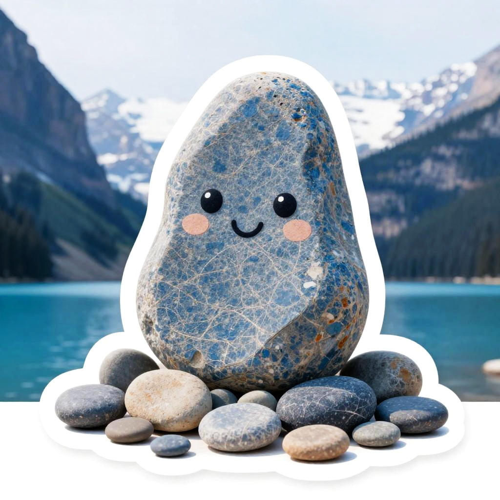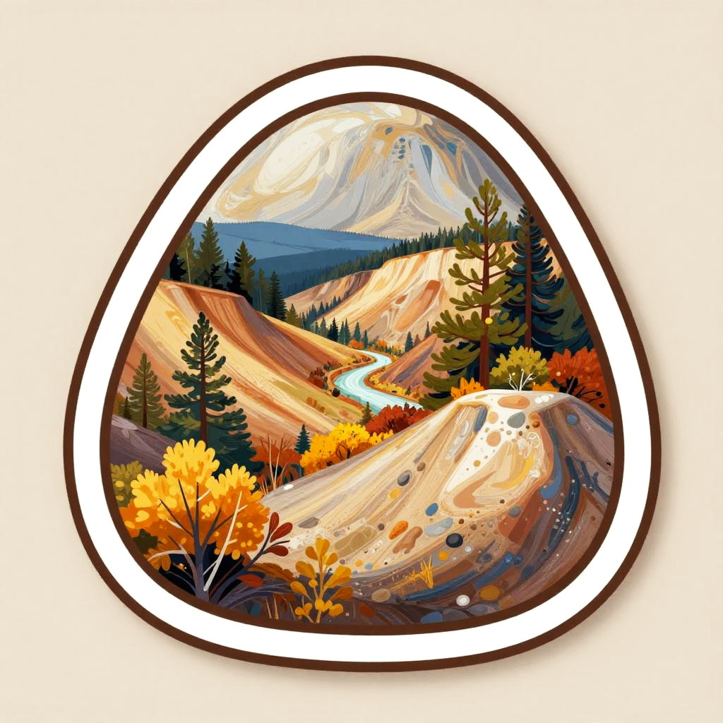 Stone: Cute, colorful, realistic depiction of Yellowstone National Park in a painterly style. Includes earthy autumn tones and high level of detail. Created as a sticker with a thick brown outline and beige background.
