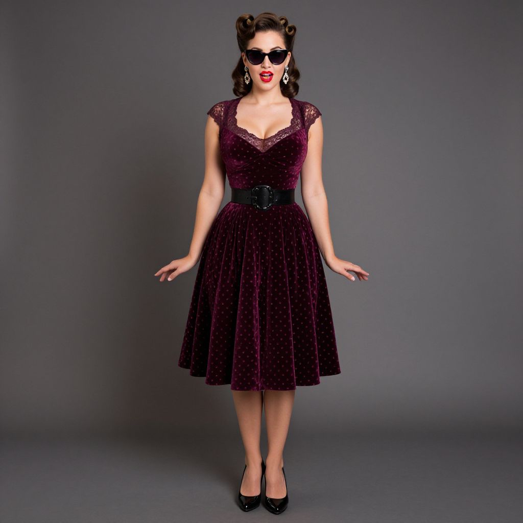 Full body shot, Hourglass woman, rockabilly velvet dress, deep burgundy color, lace trim neckline, fitted bodice, flared skirt, knee-length hem, vintage-inspired, wide black belt, cinched waist, black patent leather pumps, retro cat-eye sunglasses, bold red lipstick, playful polka dot pattern, soft velvet texture, elegant lace details, classic hairstyle, victory rolls, statement earrings, playful yet sophisticated Sexy. Pretty face and beаutiful eyes. Big breasts