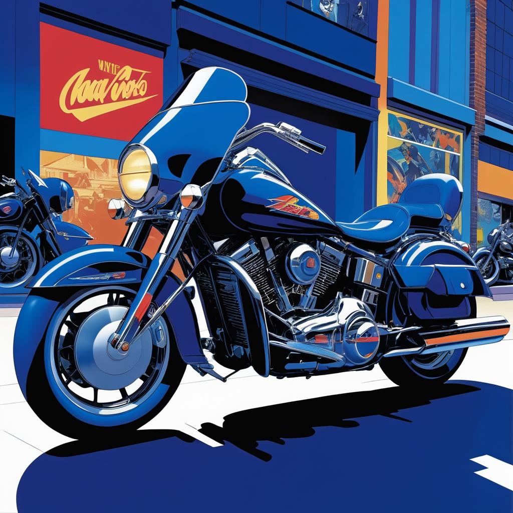 A sleek navy blue motorcycle, no people, styled by Alex Ross, with vibrant colors and comic cover art influences.