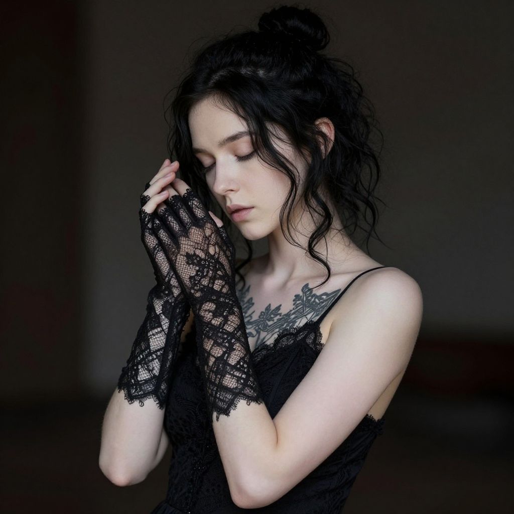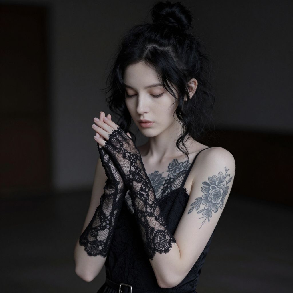 Photograph of a young woman with pale skin and dark, wavy hair in a high bun. She has extensive black lace tattoos on her arms and chest, and is wearing a black, sleeveless dress with matching lace gloves. Her eyes are closed, and she's holding her hands together near her face. The background is dark and blurred, making her the focal point. She has a calm, introspective expression.