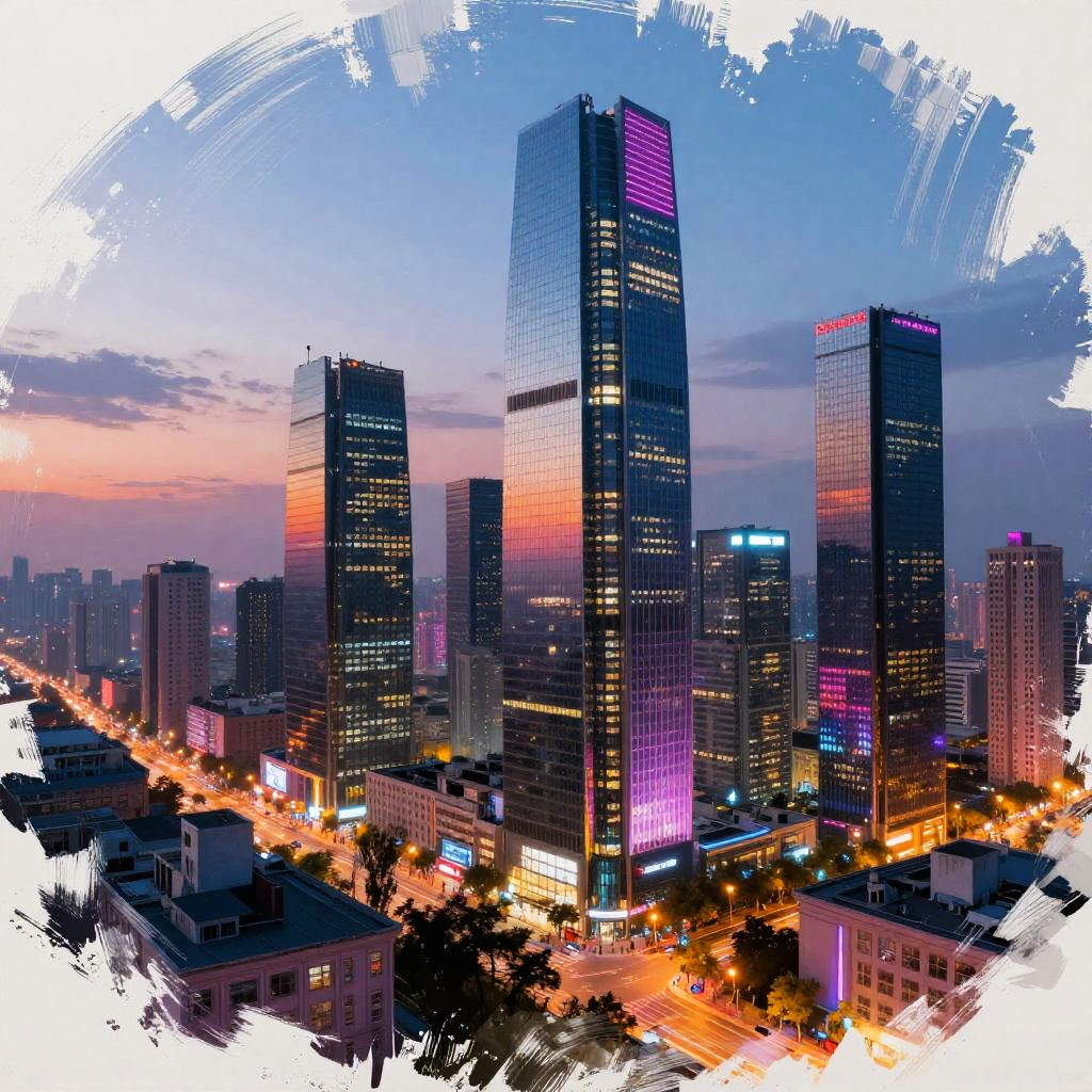 This digital painting depicts a vibrant cityscape at twilight. Tall skyscrapers with reflective glass facades dominate the scene, illuminated by colorful lights—primarily pink, purple, and blue—on their exteriors. The tallest building in the center has a distinct pink light on its upper edge. Below, a busy street lined with bright orange streetlights snakes through the city. The sky transitions from deep blue to pink and orange hues, suggesting sunset. The edges of the image are painted with white, brush-like strokes, adding a dynamic, almost abstract frame to the composition. The overall style combines realism with artistic, painterly elements.