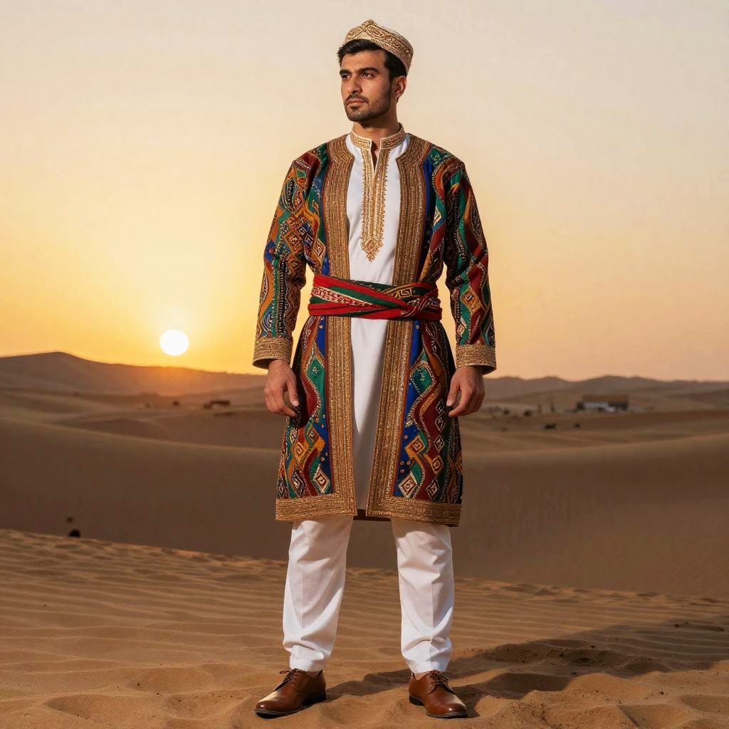 Iranian traditional dress male, handsome model wearing colorful patterned tunic and sash, traditional leather shoes, detailed textures, set against desert backdrop at sunset