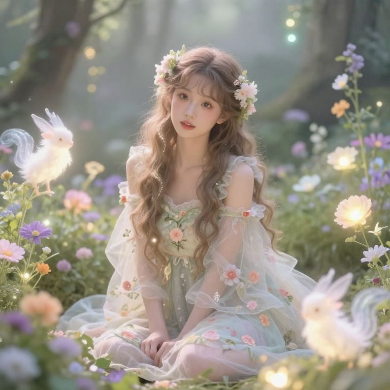 Rapinzel in a lush enchanted garden, her hair shimmering like threads of gold tangled among blooming roses and ivy, a gentle breeze moving the petals, ethereal light illuminating her delicate features, fairy tale setting with magical creatures in the distance