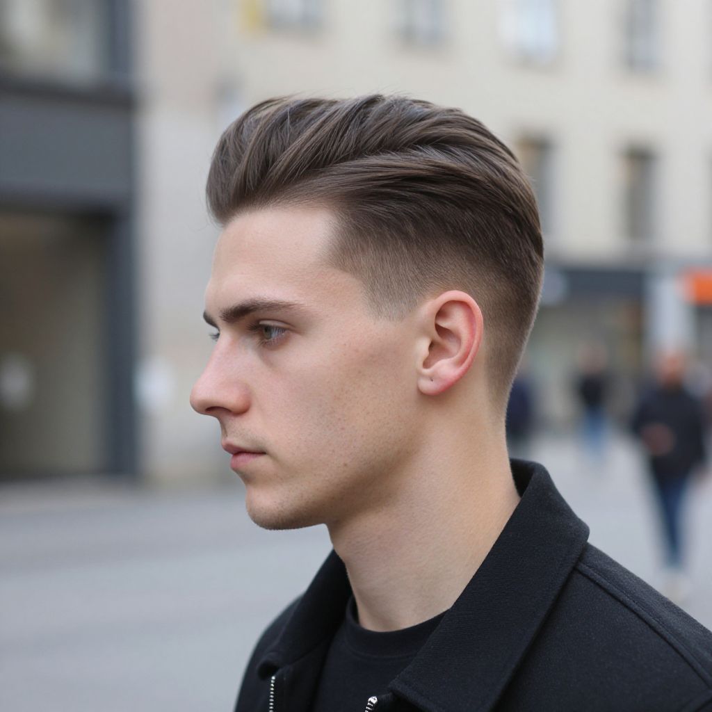 Modern side part haircut, fit european man, candid street style photography, urban environment, sharp facial lines, contemporary fashion